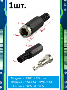 Разъем питания штекер DC005 5.5 x 2.1 12VDC/5A под пайку |
