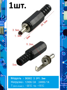 Разъем питания штекер DC002 3.5 x 1.3 12VDC/2A под пайку |